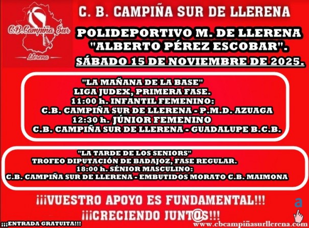 QUINTA JORNADA DE LA COMPETICIÓN JUDEX-FEXB Y DEL TROFEO DIPUTACIÓN DE BADAJOZ SÉNIOR 2025/26. TENDREMOS "LA MAÑANA DE LA BASE FEMENINA" Y "LA TARDE DE LOS SENIORS" EN EL "ALBERTO PÉREZ". ¡NO FALTÉIS!