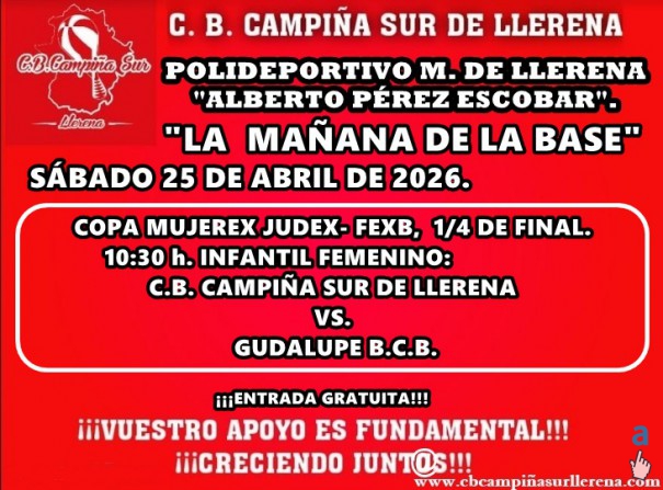 El sábado 25 de abril de 2026, "LA MAÑANA DE LA BASE" en el "ALBERTO PÉREZ", con los 1/4 FINAL COPA MUJEREX JUDEX-FEXB a un único partido, para nuestro equipo de la BASE INFANTIL FEMENINO. ¡¡¡A LLENAR EL "ALBERTO PÉREZ!!! Debe ser de nuevo la fiesta del baloncesto, animando al máximo, SIEMPRE DESDE EL RESPETO Y LA DEPORTIVIDAD.
