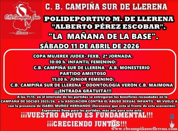 El jueves 9 de abril de 2026, a las 20:45 h., nuestro equipo SÉNIOR MASCULINO jugará 1/4 FINAL PARTIDO DE IDA DEL TROFEO DIPUTACIÓN DE BADAJOZ-FEXB, en el "ALBERTO PÉREZ", frente a C.B. SAJRA. Esperamos una polideportivo lleno, animando y apoyando SIEMPRE DESDE EL RESPETO y LA DEPORTIVIDAD. ¡¡¡A LLENAR EL ALBERTO PÉREZ!!!